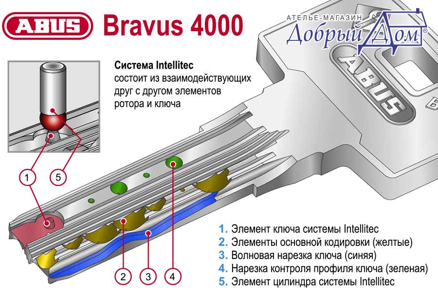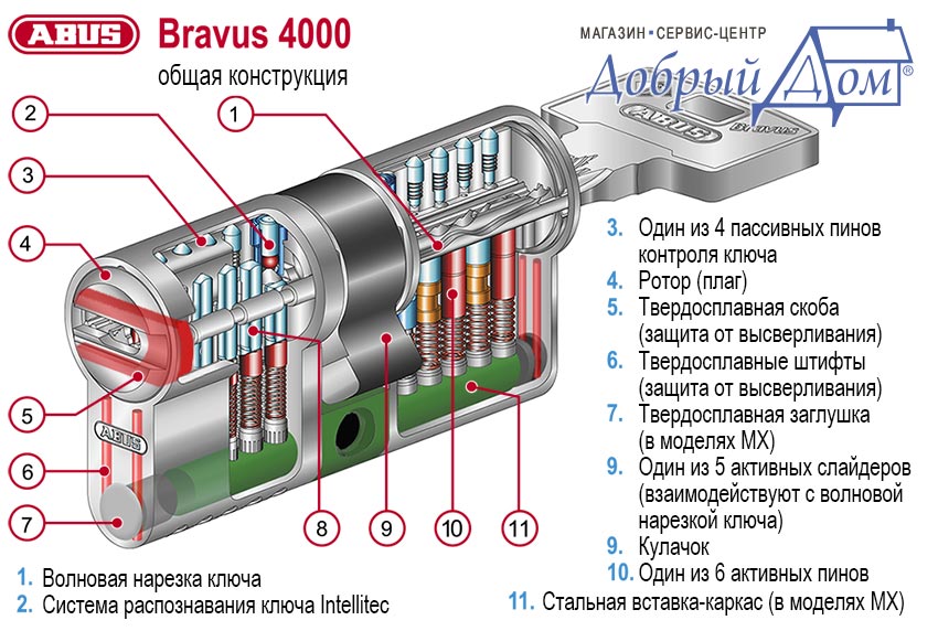 Взломостойкость Abus Bravus 4000 строится на 15 секретных элементах, расположенных в двух плоскостях — это 6 активных пинов основной кодировки, 5 пинов слайдерного типа и 4 пассивных пина контроля профиля ключа. Слайдерные пины взаимодействуют со сложным волновым узором ключа, секретность дополнительно повышается за счет системы интеллектуального распознавания ключа Intellitec System. Ее работа строится на интерактивном элементе ключа и его взаимодействии со специальным элементом ротора — при отсутствии интерактивного элемента цилиндр не откроется даже при совпадении всех остальных кодировок.