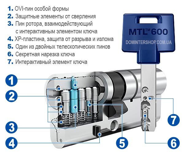 MTL600 обеспечивает высокий уровень защиты от тихих методик вскрытия личинок — совокупность телескопических пинов и интерактивного элемента ключа позволяет использовать сердцевину для решения большинства бытовых задач. Службы аварийного открытия MTL600 просто разрушают, тем не менее MTL600 нельзя назвать невскрываемым механизмом, и даже бытовые задачи бывают очень высокими — в этом случае следует обратить внимание на сердцевину MTL800, обладающую более высокой защитой от вскрытия.