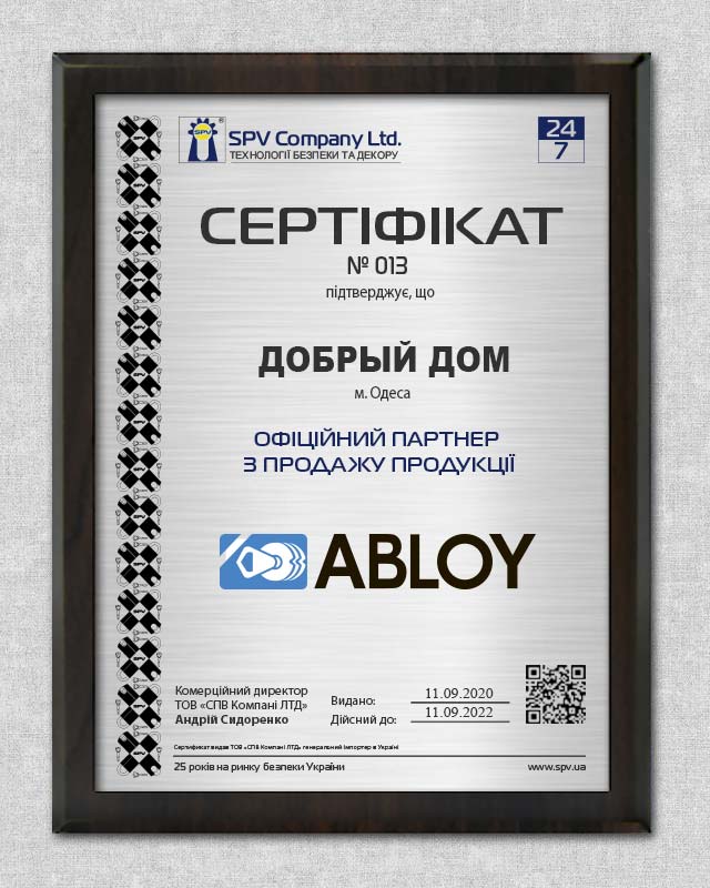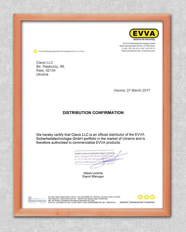 Незважаючи на те, що багато продукції ми отримуємо безпосередньо з заводів, отримати, наприклад, сертифікат офіційного партнера в Німеччині чи Італії дуже важко — деякі виробники їх зазвичай не надають, вважаючи це зайвим. Тому сертифікати, що наведені на цій сторінці, не відображають повного стану речей. А отриманий у Відні сертифікат офіційного партнера EVVA можна вважати щасливим для нас винятком.