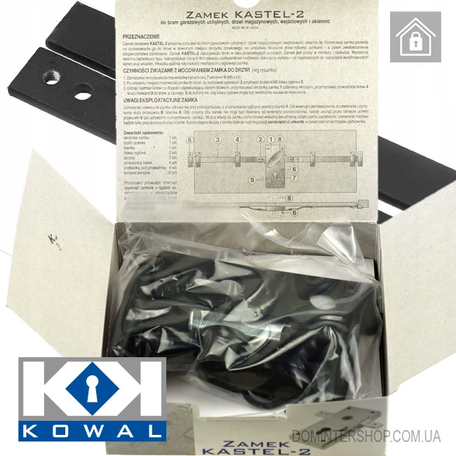 Накладний замок Kowal Katel-2 призначений для використання в гаражах, воротах, віконницях та інших місцях, де його використання буде доцільним. Модель належить до серії Kastel, замки якої однакові, але мають різну кількість та напрямок сторін замикання — у цієї моделі багатостороннє замикання з 2 точками у горизонтальному напрямку (зліва та справа). Замок комплектується довгими тягами, що виконують роль замикальних елементів — вся конструкція нагадує крабову систему.