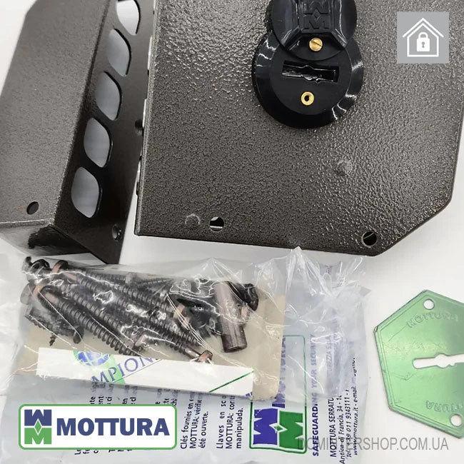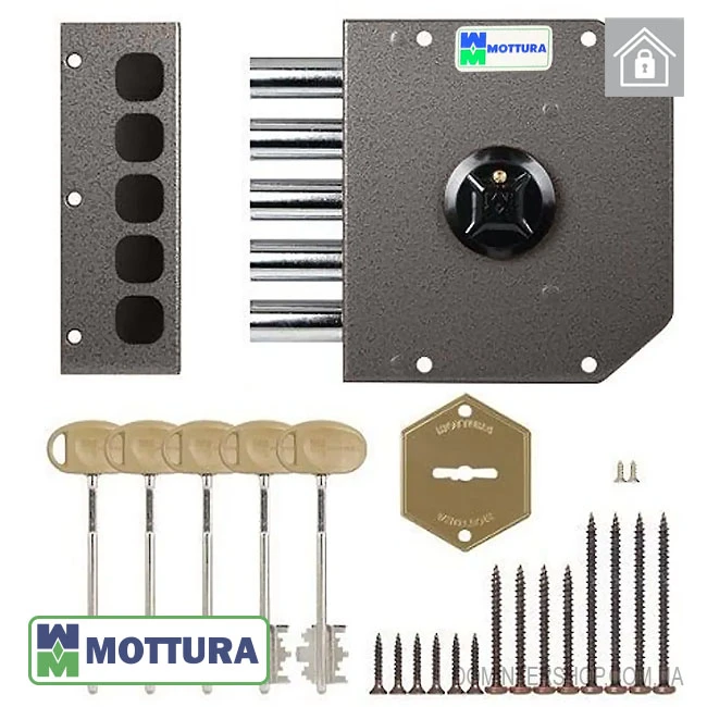 Замок комплектується 5 ключами, відповідною частиною (коробкою), декоративною накладкою та комплектом кріпильних елементів.