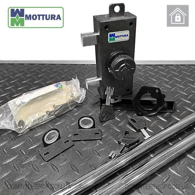 Замок комплектується 3 ключами, запірною частиною (коробкою), декоративною накладкою, комплектом кріпильних елементів та тягами до крабової системи.