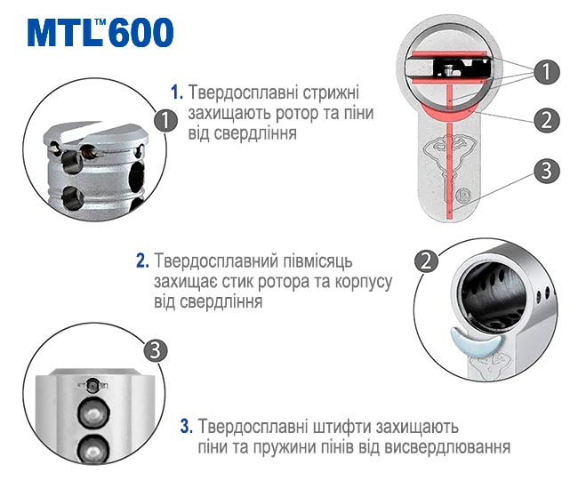 MTL600 забезпечує високий рівень захисту від тихих методик розкриття личинок — сукупність телескопічних пінів та інтерактивного елемента ключа дозволяє використовувати серцевину для вирішення більшості побутових задач. Служби аварійного відкриття MTL600 просто руйнують, але MTL600 не можна назвати нерозкривним механізмом, і навіть побутові завдання бувають дуже високими — у цьому разі слід звернути увагу на серцевину MTL800, що має вищий захист від розкриття.