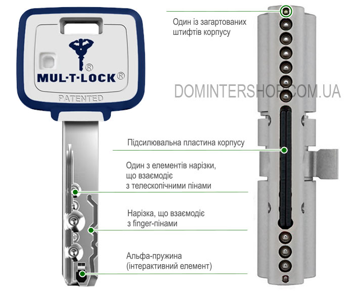Основою секретності циліндра є запатентовані технології Mul-T-Lock Telescopic Pin, Finger Pins та Alpha-spring.