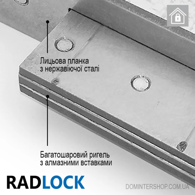 Одним із вразливих місць замків є ригелі — їх можна втиснути всередину корпусу або зламати, причому ламаються не самі ригелі, а місце їх кріплення до ригельної пластини (зазвичай таке відбувається при зламі дверей ломиком методикою віджиму). Замки Радлок оснащені захистом від перерахованих вразливостей — вдавлюванню запобігає особлива конструкція важільних приводів, що призводить до запланованого перекосу ригеля та його блокування спеціальною пластиною.