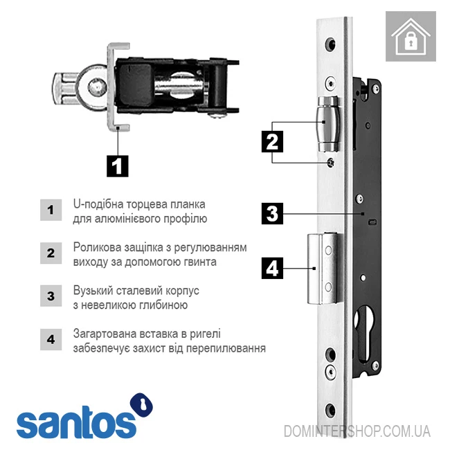 Модель належить до 720-ї серії легких замків Сантос, яка має однакові за конструкцією моделі, але з різним бексетом, глибиною корпусу та шириною планки (22 мм та 24 мм). Пропонований замок має бексет 25 мм і торцеву планку 240х24 мм. Модель оснащена роликовою защіпкою, величина виходу якої регулюється гвинтом.